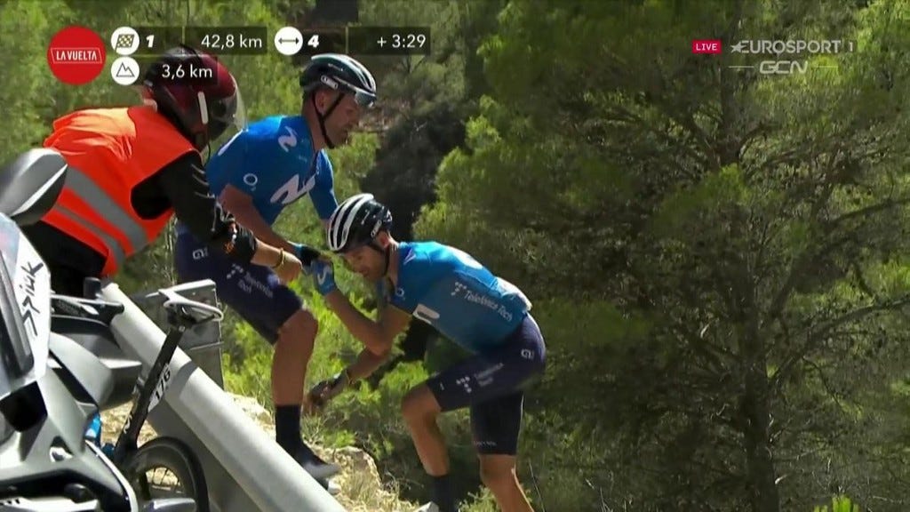 The camera arcs round the corner, Carapaz low on our screens. Behind him the wheel slips, and with it our sense of normality. A Valverde DNF. A collector’s item.